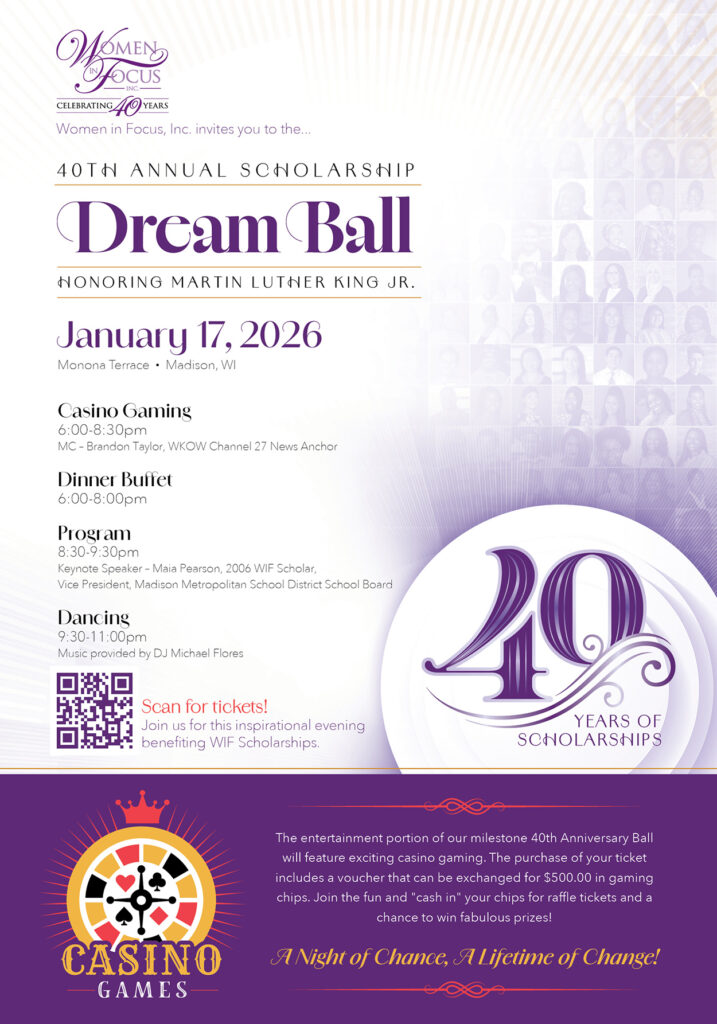 Since 1983, Women In Focus, Inc. (WIF) has been proud to encourage and support underrepresented students to succeed in education through our scholarship fund. WIF deeply believes in the abilities and talents of our Dane County scholars and that education beyond high school, in college or the trades, is key to their future and to building stronger communities locally, nationwide and worldwide. Our funding has come from the generosity of sponsors, donors and guests at our Dream Ball, held each January in honor of Dr. Martin Luther King, Jr.